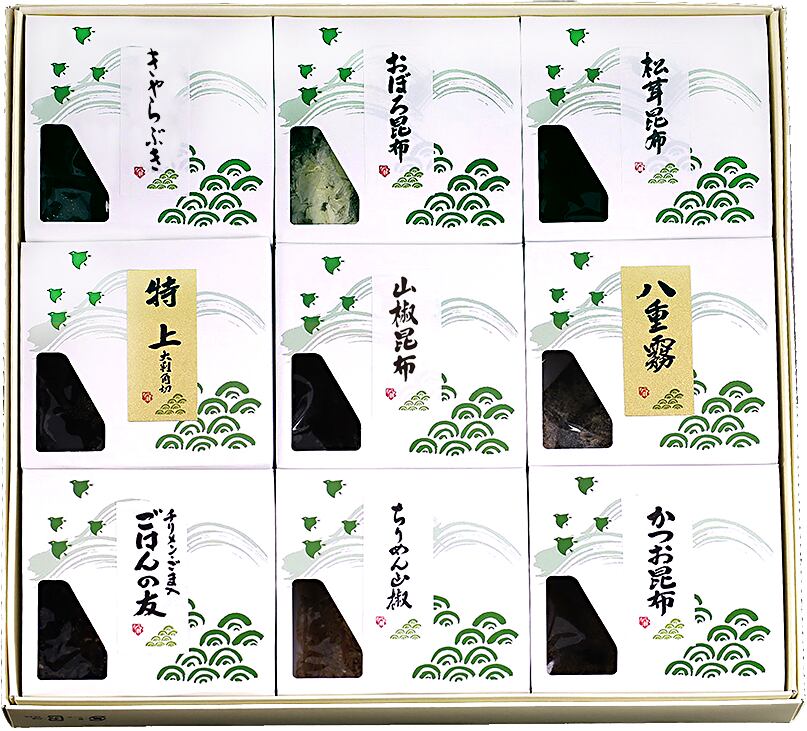 <箱ギフト佃煮>きゃらぶき・おぼろ昆布・松茸昆布・特上・山椒昆布・八重霧・ごはんの友・ちりめん山椒・かつお昆布